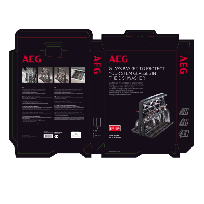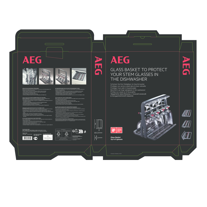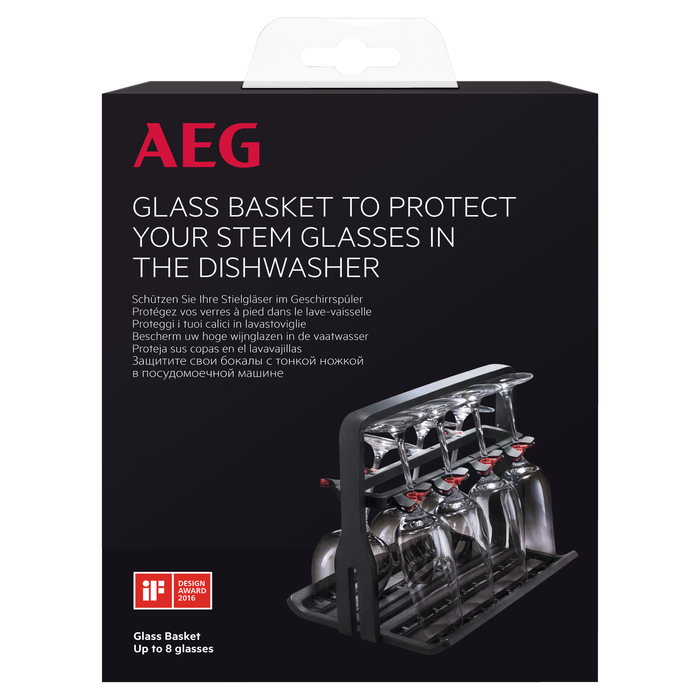 Vďaka košíka na poháre AEG môžete do umývačky riadu s dôverou vložiť tie najkrehkejšie poháre. Tento košík na poháre pojme vďaka väčšej kapacite a flexibilite než u iných umývacích systémov až osem pohárov na víno, ktoré mäkko avšak pevne a úplne bezpečne uchytí. Môžete tak používať a umývať vaše najkrajšie poháre tak často, ako chcete. Univerzálne rozmery sú vhodné do všetkých 60 a 45cm umývačiek riadu, a keď ho nepoužívate, zloží sa naplocho pre jednoduché uloženie.