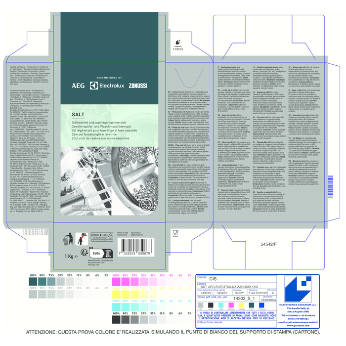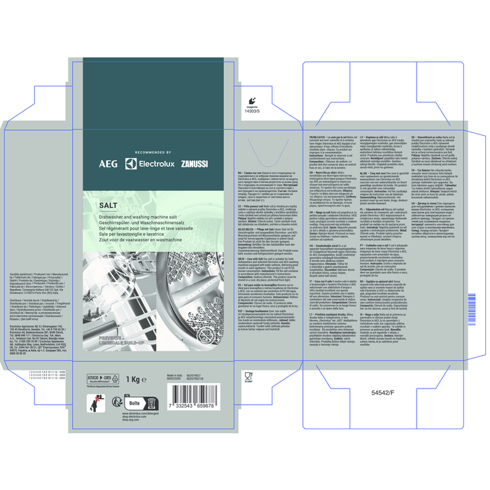 Táto soľ zastaví hromadenie vodného kameňa a vápnika, ktorý negatívne ovplyvňuje vaše spotrebiče. Túto soľ možno použiť v umývačkách riadu a vybraných práčkach (so softwater technology AEG 9000 a Electrolux 900). Je tak zachovaná žiarivosť riadu a pestré farby oblečenia.
