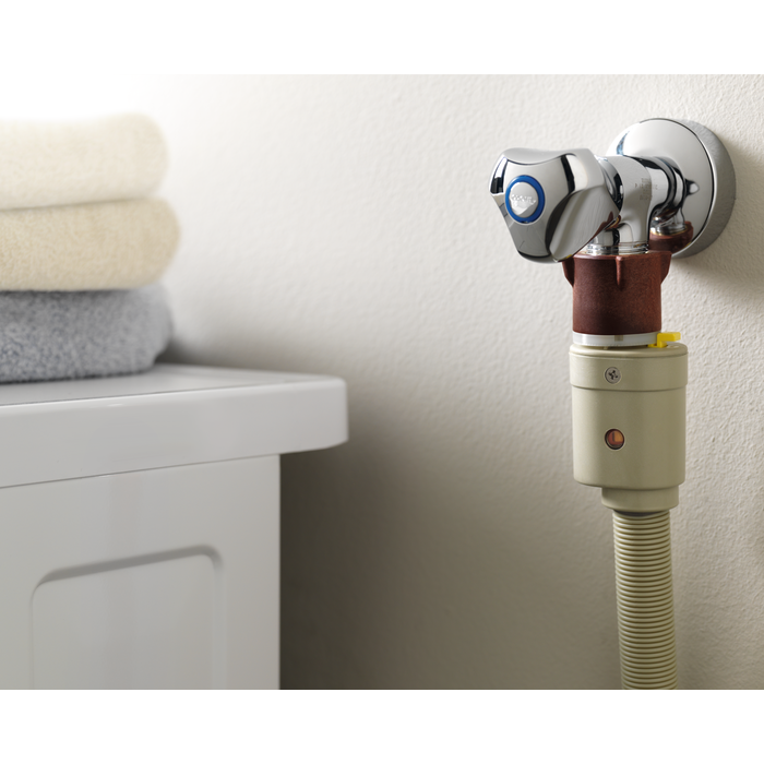 Prívodná hadica bezpečnostného systému je vybavená špeciálnym uzatváracím ventilom, ktorý reaguje na kontakt s vodou a pri prepojení zastaví prietok vody. Malé okienko vás upozorní, keď bude hadicu potrebné vymeniť.