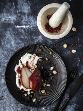 Hrušku ošúpeme, celú ju vložíme do vákuového vrecka spolu s redukovaným vínom a zavákuujeme na 100 % vákua.