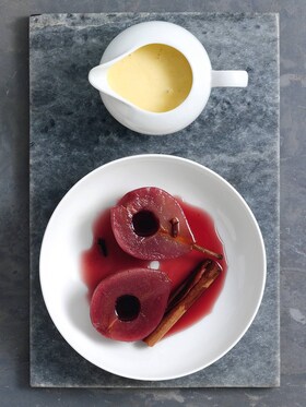 1 Červené víno a cukor zredukujte v rajnici na polovicu. Hrušky rozpoľte, ošúpte a odstráňte jadrovníky. Hrušky a červené víno utesnite vo vákuovacom vrecku spolu s korením pomocou vákuovacej zásuvky.