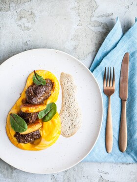 BRAVČOVÉ LÍČKA DUSENÉ V CIDERI SO ZEMIAKOVO-MRKVOVÝM PYRÉ