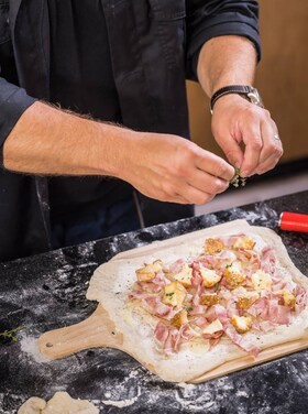 Cesto dobre spracujeme, rozdelíme na šesť dielov a na pomúčenej pracovnej ploche vyvaľkáme šesť tenkých oválnych koláčov. Prenesieme ich na plech vyložený papierom na pečenie, potrieme crème fraîche s bylinkami a na to poukladáme slaninovú zmes.
