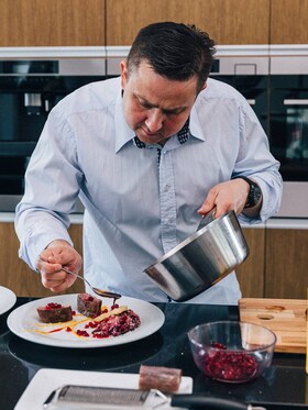 Opečené mäso vložíme do vrecka, vákuovo utesníme a varíme asi 35 minút v parnej rúre pri teplote 65 °C metódou Sous-Vide. Pred podávaním mäso krátko zohrejeme a dopečieme na panvici, aby bola koža správne chrumkavá. Do výpeku prilejeme červené víno, dôkladne prevaríme a zahustíme studeným maslom.