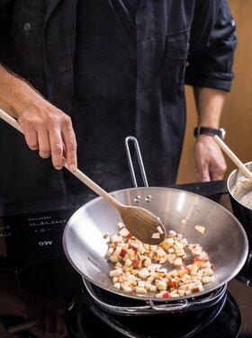Jablko olúpeme, zbavíme jadrovníka a pokrájame na kocky. Na panvicu dáme rozohriať javorový sirup, potom vložíme jablká a pokvapkáme vodou, nakoniec pridáme hrozienka, škoricu a necháme restovať. Postupne necháme jablká zmäknúť (prípadne pridávame trochu vody, ktorá sa vyparí). Na kašu vložíme lyžičku masla a navrstvíme zmes karamelizovaných jabĺk.