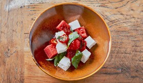 Sušené i čerstvé paradajky nakrájame, osolíme a pokvapkáme malinovým octom. Melón vyberieme, nakrájame na väčšie kocky, pokvapkáme olivovým olejom, pridáme fetu a zmiešame s paradajkami. Na záver natrháme listy bazalky a zľahka premiešame.