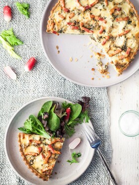 Po upečení necháme koláč na chvíľku vychladnúť a potom ho nakrájame na jednotlivé porcie. Zmes listových šalátov opláchneme a osušíme, dochutíme olivovým olejom, citrónovou šťavou, soľou, korením a podávame spolu s koláčom.