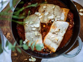 4 filety ostrieža nílskeho (alebo iné biele ryby), 400 g konzerva celých konzervovaných paradajok (môžu byť aj drvené), 3 bobkové listy, 3 strúčiky cesnaku, olúpané, na plátky nakrájané, 1 lyžica olivového oleja, 2 lyžice balzamikovej redukcie, 2 lyžice olív taggiasca (*úvod), morská soľ, čerstvo zomleté čierne korenie