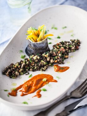 Pstruha podávame na šošovicovom šaláte s omáčkou z pečených paprík.