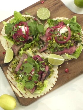 - Na rozpálenom grile opečte tortily. Potom ogrilujte mäso na úroveň prepečenia, akú máte radi. Mäso nechajte 3 – 5 minút odpočívať a nakrájajte ho na tenké plátky.