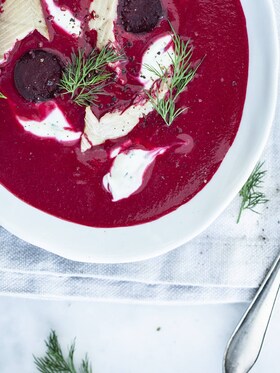 POLIEVKA Z ČERVENEJ REPY S ÚDENÝM PSTRUHOM, SMOTANOU A KÔPROM