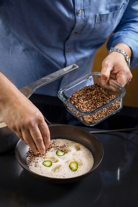 Pomocou tyčového mixéru speníme uvarenú polievku. Do taniera vložíme cibuľu a opečenú slaninu, pridáme spenenú polievku a zasypeme opraženou quinoou.
