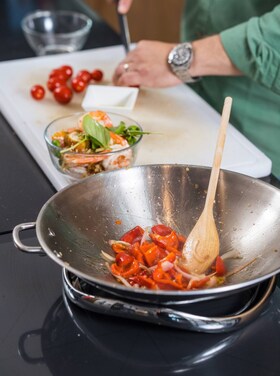 Medzitým si očistíme panvicu Wok Fusion. Rozpálime ju a opečieme na nej olúpané krevety. Pridáme nakrájaný cesnak a posypeme nasekanou petržlenovou vňaťou.